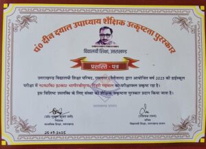 राज्य स्तर पर शैक्षिक उत्कृष्टता के लिए नरेंद्र महिला विद्यालय इंटर कॉलेज भागीरथीपुरम को कक्षा 10th एवं 12th बोर्ड परीक्षा 2025 में उत्कृष्ट प्रदर्शन के लिए वर्ष 2025 के लिए दिनाँक 25/09/2025 को SCERT के सभागार में माननीय शिक्षा मंत्री डॉ0 धन सिंह रावत जी,माननीय मुख्यमंत्री श्री पुष्कर सिंह धामी जी एवं शिक्षा महानिदेशक दीप्ति सिंह जी की उपस्थिति में पं0 दीनदयाल उपाध्याय शैक्षिक उत्कृष्टता पुरस्कार से सम्मानित किया गया।टिहरी जिले में नरेंद्र महिला विद्यालय भागीरथीपुरम यह सम्मान प्राप्त करने वाला श्रेष्ठ 50 विद्यालयों की सूची में शामिल है।इस उपलब्धि पर विद्यालय की उप-प्रधानाचार्या महोदया श्रीमती अल्का कठैत जी ने खुशी व्यक्त करते हुए कहा है कि विद्यालय के लिए यह अत्यंत हर्ष एवं गौरव का विषय है तथा इसका श्रेय समस्त छात्राओं,शिक्षिकाओं एवं कर्मचारी गण को जाता है व छात्राओं को इसी प्रकार निरंतर आगे बढ़ने के लिए प्रेरित किया।